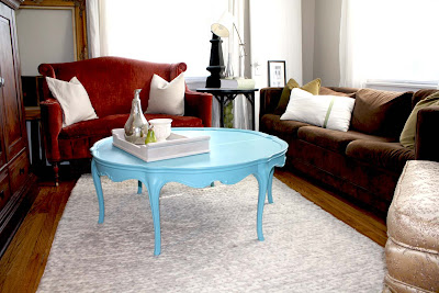 I purchased this coffee table last year for $15 at a local thrift store. We previously had a rectangle coffee table that made it difficult to manuver in our little Living Room. So the circle table is working great for that. I painted it this shade of aqua when I purchased it but I was intending it to be darker.