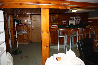 After: Sorry for the not great picture as the glaring light from the windows makes it difficult to photograph. We removed the awful bar and all the wood paneling. It was waterproof, insulated, and drywalled, along with new windows and recessed lighting. We also installed a vinyl laminate wood floor.The old entrance to the Laundry room :