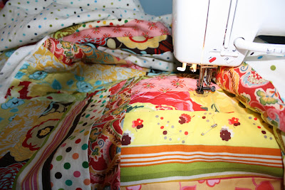 This has been my seat for the past couple of days. In the 6th week of my Quilt Along I am teaching myself/learning from tutorials how to free motion quilt with a darning foot. Yikes it is a little tantalizing. I found a wonderful blog by small means. April is an amazing crafter, I am in love with her loopy quilting style and that is what I am attempting this week on my Quilt Along quilt. It is turning out so cute, I am loving it and getting a great arm workout at the same time.