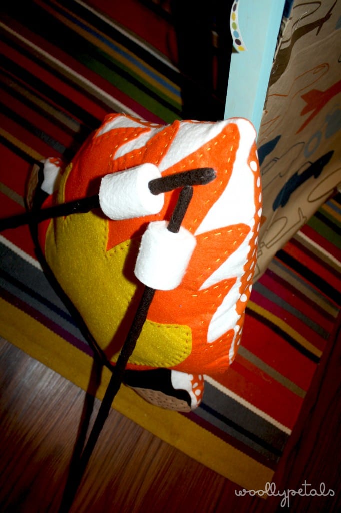 I also thought it would be fun to have some marshmallows to roast and know these will be a hit since my son loves them too! I wrapped dowels in felt a couple times to soften them and make them brown like sticks. I then cut strips of white warm & natural and slowly rolled it around the sticks glueing every so often so that they stay until I had roughly the size of marshmallows.