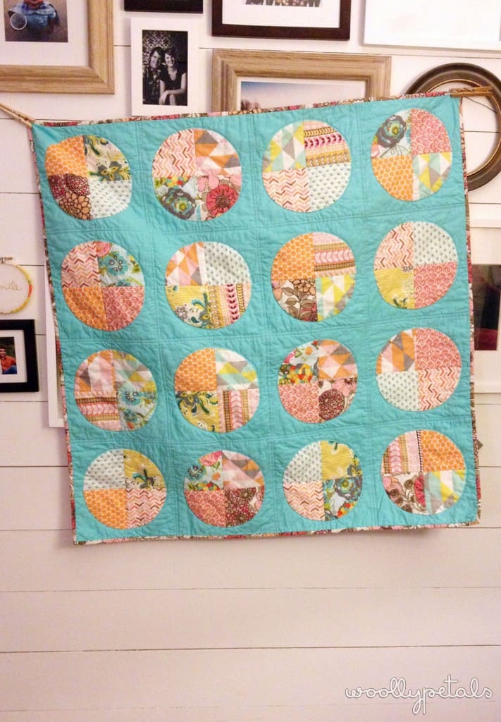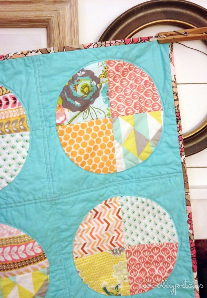 I made her a circle quilt! My first quilt with circles, and you know what not as hard or as scary as it appears. :) I found this drunkards path quilt along from Needles and Spatula. She has a great template that I used that is free to download. If you have been wanting to try curves or circles do it. You will be glad you did.