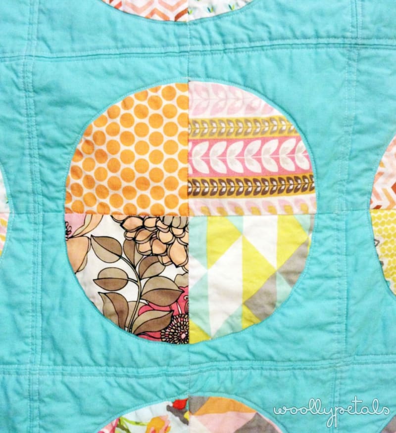 I made each circle a patchwork with 4 different patterns in each. 16 circles in all. The Background is Kona color: aqua. It's such a lovely blue. I super Love working with Kona, it's the only solid I use if I can help it.