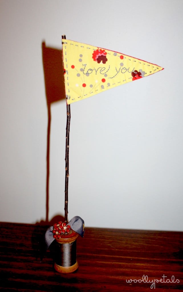 The flag is stitched to a twig and mounted in a vintage spool. It stands approx. 13″ tall and the flag is approx. 6″ wide.
