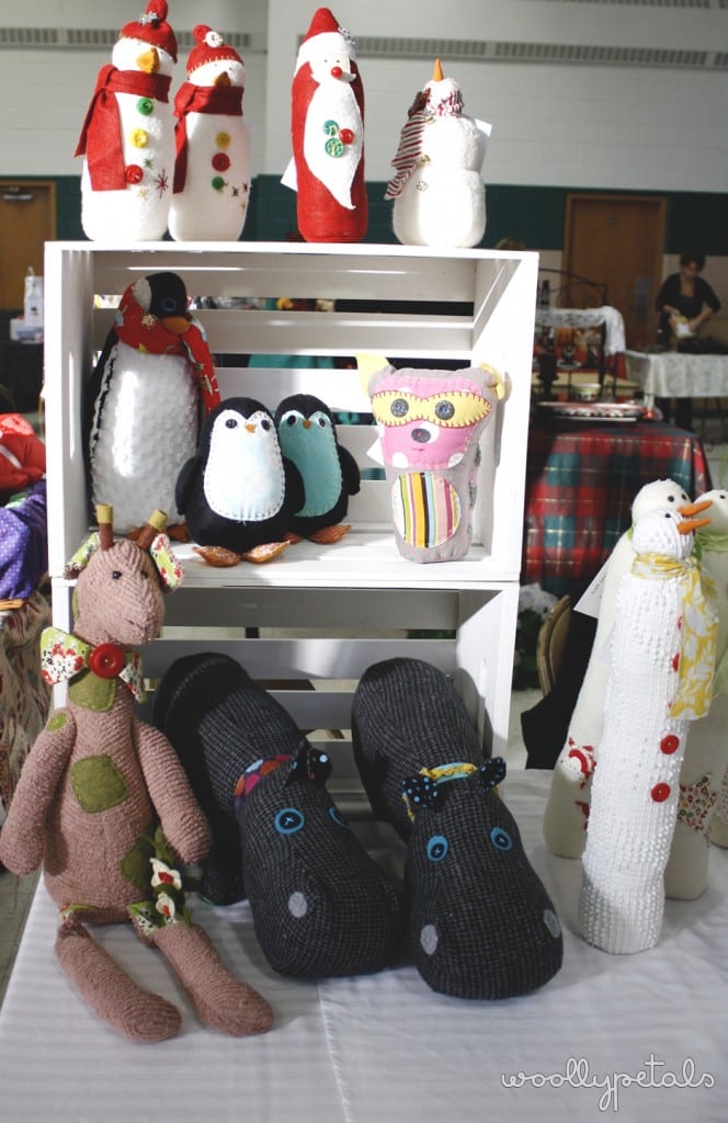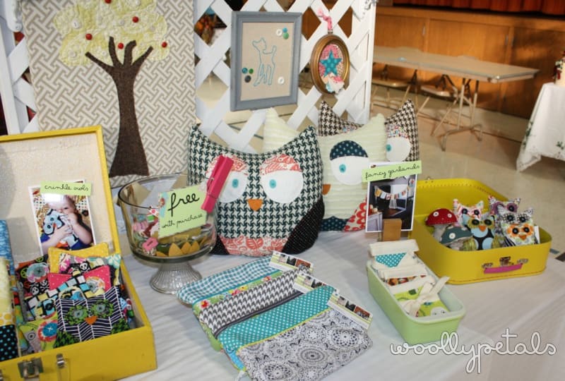 On this side, I have the owl pillows, mini owls & mini mushrooms in the smaller suitcase, fancy garlands in the pyrex, and zippered pouches.