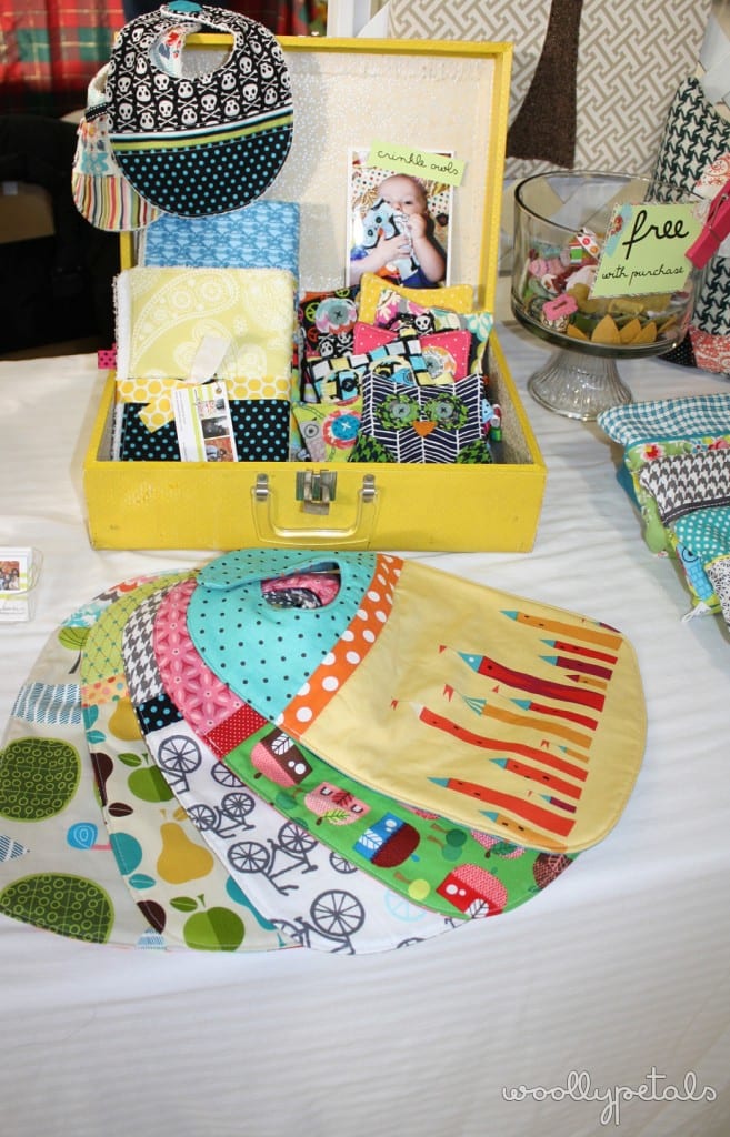 In the middle here I have the baby stuff, burp cloth sets & crinkle owls in the suitcase, big kid bibs on the table, and drool bibs hanging on the suitcase.