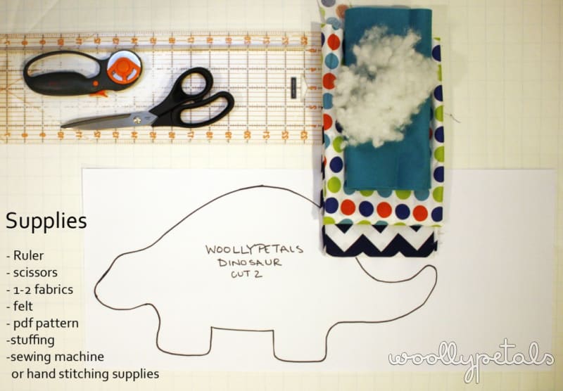 Print the Pdf and tape the three pieces together. You can size to your liking, but when printing at 100% you will make a dinosaur 17″ nose to tail. Cut out two Dinosaurs, 1 regular, 1 reverse, use two different fabrics if desired: The easiest and fastest way to do this is to lay your fabrics on top of each other right sides together, pin the pattern on top and cut out.