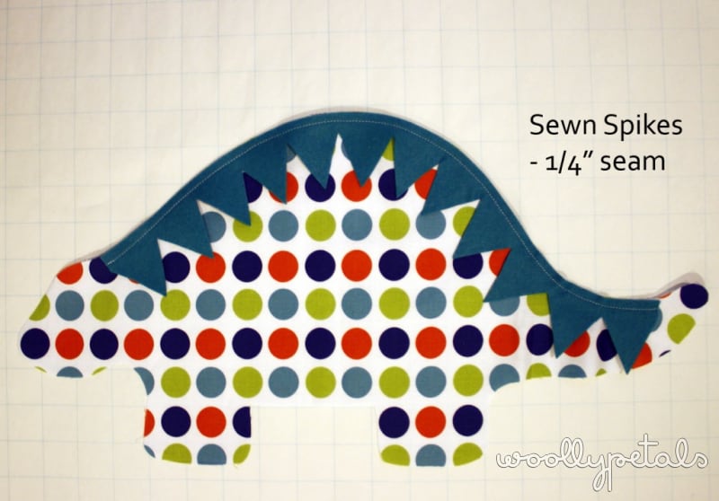 Sew the spikes on using a 1/4″ seam allowance. Make sure to lock or reverse/forward your seams at beginning and end so the stitching doesn't unravel.