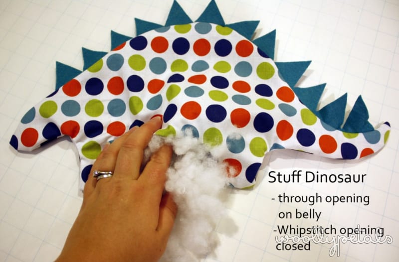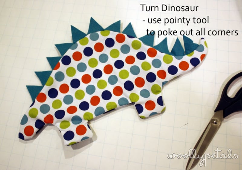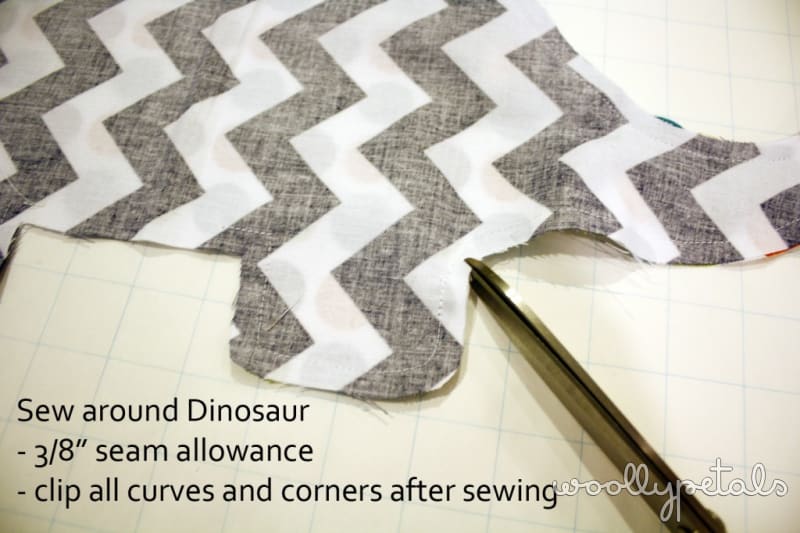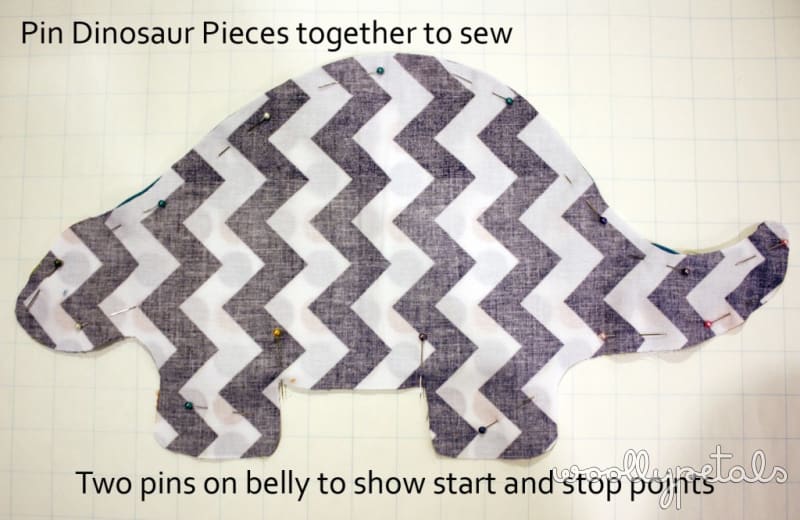 Pin the two dinosaur pieces together and sew around starting on one side of belly and ending on the other so you have the belly portion open to turn and stuff the dinosaur. Sew with a 3/8″ seam allowance. Make sure to lock or reverse/forward your seams at beginning and end so the stitching doesn't unravel. If you serge the seams now would be the time to do that. If you have never serged it is a good way to add stability to the seams, either use your serger or a zigzag stitch around the edge.