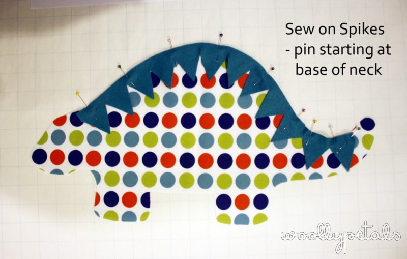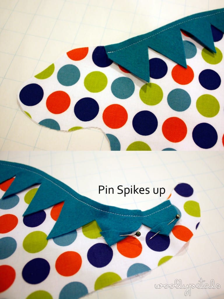 Pin Spikes to one of the dinosaurs. Starting at the neckline and pinning till you are 1/2″-1″ from the tail end, if you spikes are longer than that just cut off the extra.