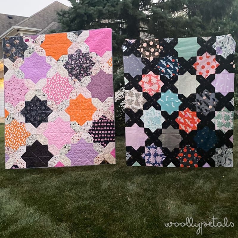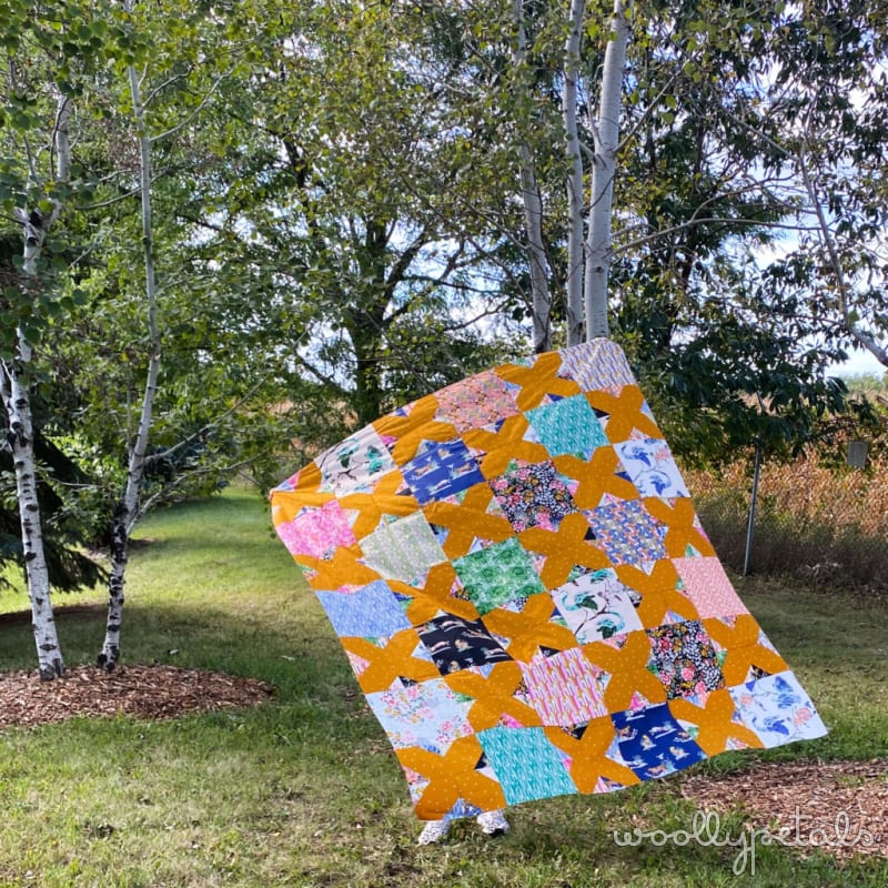 The Floored10 Pattern includes 5 sizes. The Baby size is 38″ x 47″ and uses half a layer cake or a junior layer cake. The Standard Throw size (shown above) is 57″ x 66″ and uses a full layer cake. The Large Throw is 66″ x 76″ and uses 1-2 layer cakes. The Twin size is 66″ x 85″ and uses 2 layer cakes. The Queen size is 85″ x 95″ and uses 2-3 layer cakes. They all also require yardage for the X's. The pattern gives layer cake requirements, or yardage requirements in yards and FQ's. So you can make the Floored10 without using Layer Cakes as well.