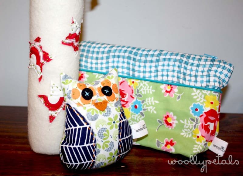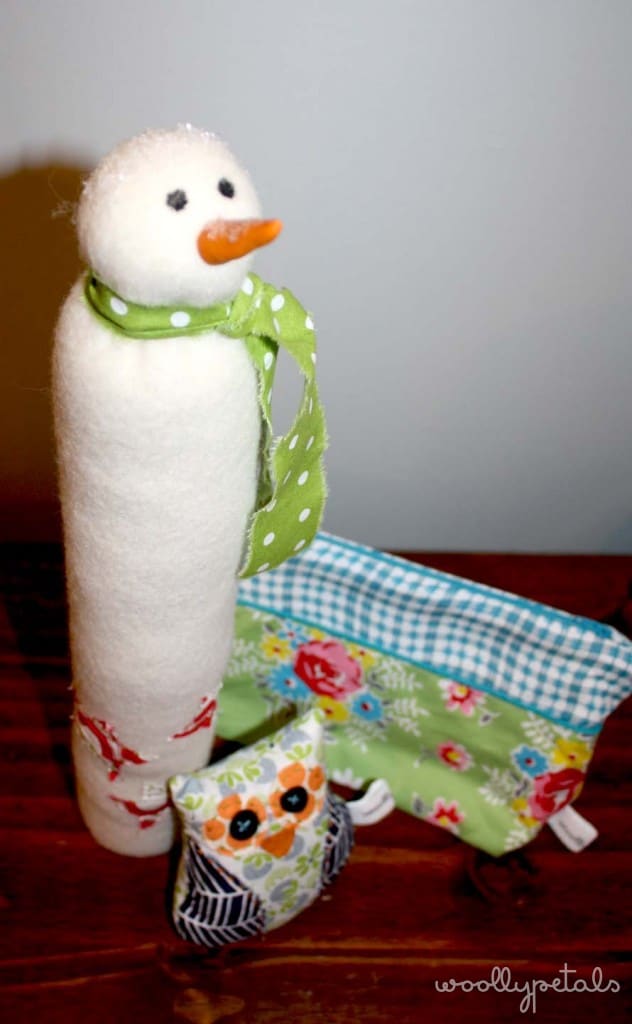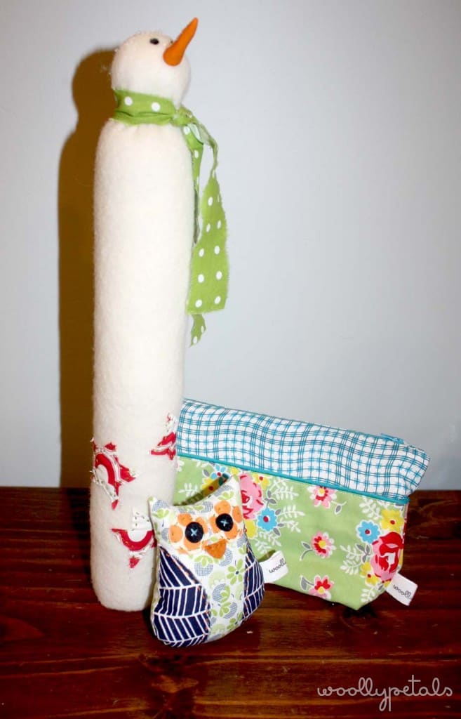 A tall 100% wool felt snowman who stand on his own. He has fabric stars stitched on, and a raw scarf, and a sprinkle of sparkly snow on his head. A mini Owl with all handstitched detail. Last a nice little zippered pouch that is the perfect size for makeup, a catch all of stuff in your purse, or to store your little handy project you want to carry with you.