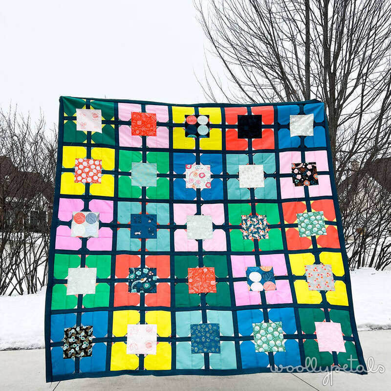 Art Gallery Solids paired with Ruby Star Society Starry in multi and scrappy carmel fabric X's make this a bright and fun large block with X Star middle Hearts All Around Quilt.