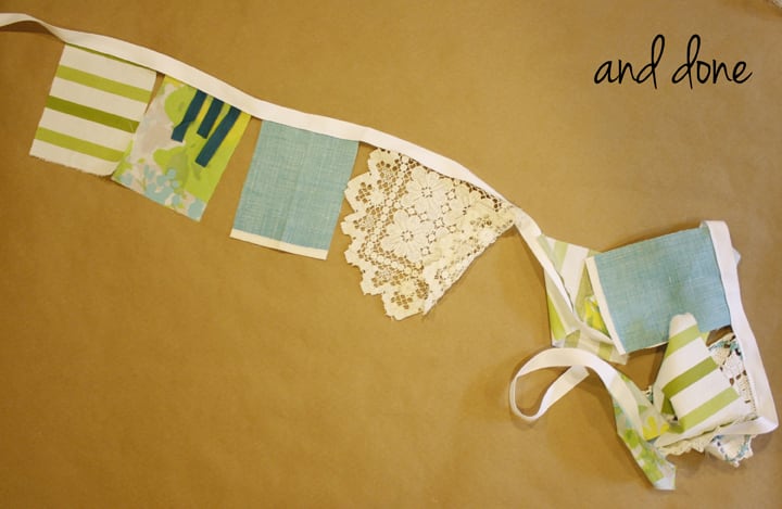 To sew on I leave a 10″ tail on either end to hang the garland from. You can tie it to something or pin or tape it up.
