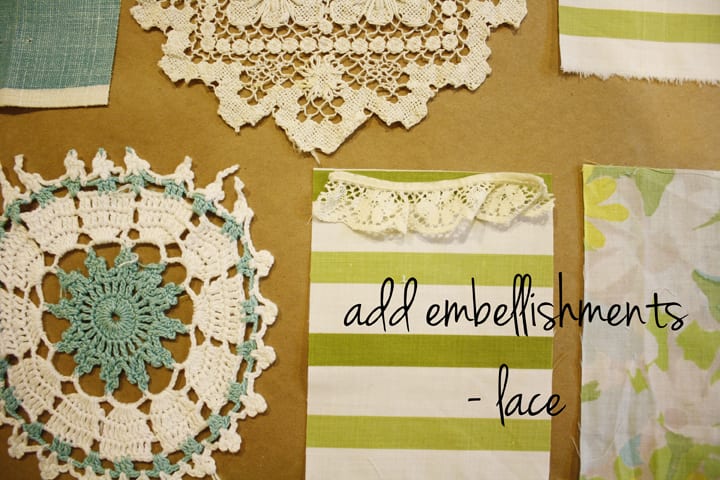 My fabrics came from thrifted vintage sheets, this is a fabulous way to acquire a lot of fabric for little money usually $2-$5 each. Don't let a stain hinder you either you can cut around it, the main things I make sure of is that is mostly or all cotton and that they are not worn through. The main exception to the all cotton rule is if it is an amazing print. I also search out doilies whenever I am thrifting, junking, or antiquing, they are a little hard to come by lately so expect to pay $.50 - $1.00 each depending on size. I purchased my twill tape on etsy from a seller that no longer has twill tape. But I have bought it from several places on etsy.
