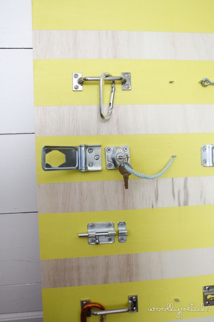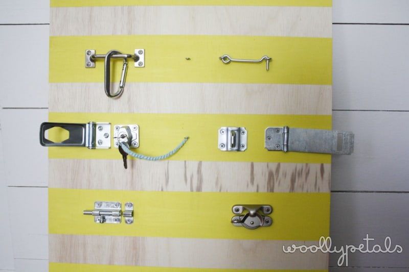 Once the stripes where dry (two coats Martha Stewart craft paint in satin Meadowlark) I laid out all my latches and handles and screwed them all down. I used a couple Utility Handles, Key Locking Hasp, Barrel Bolt, Gate Hook and Eye, Adjustable Staple Hinge Hasp, Sash Lock, Door Chain, Several Carabiners, and Screw Eyes. I found some in my miscellaneous junk and bought the rest at Home Depot. There is probably a ton of other stuff you can use.