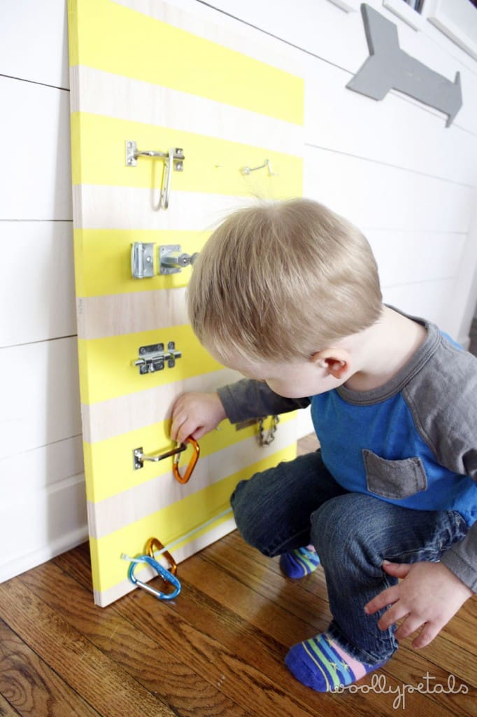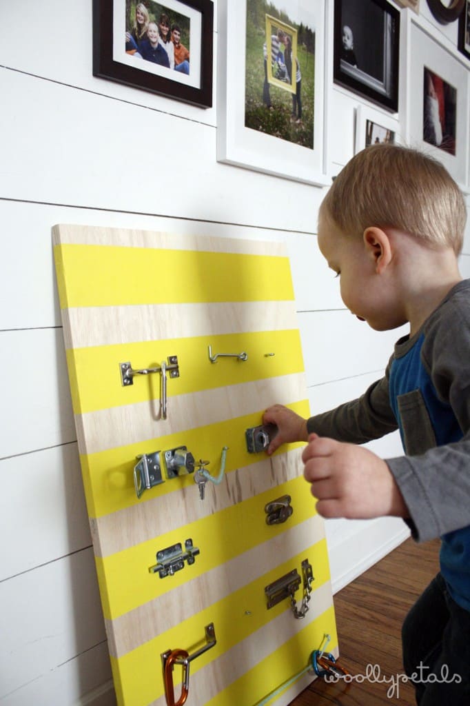 I had it sitting out for him when he came downstairs one morning and he played with it for a good 30 minutes straight. Several days later he is still loving it. It will be mounted to a wall in his play area in the basement and the top stripe is empty because I am going to add numbers across the top.