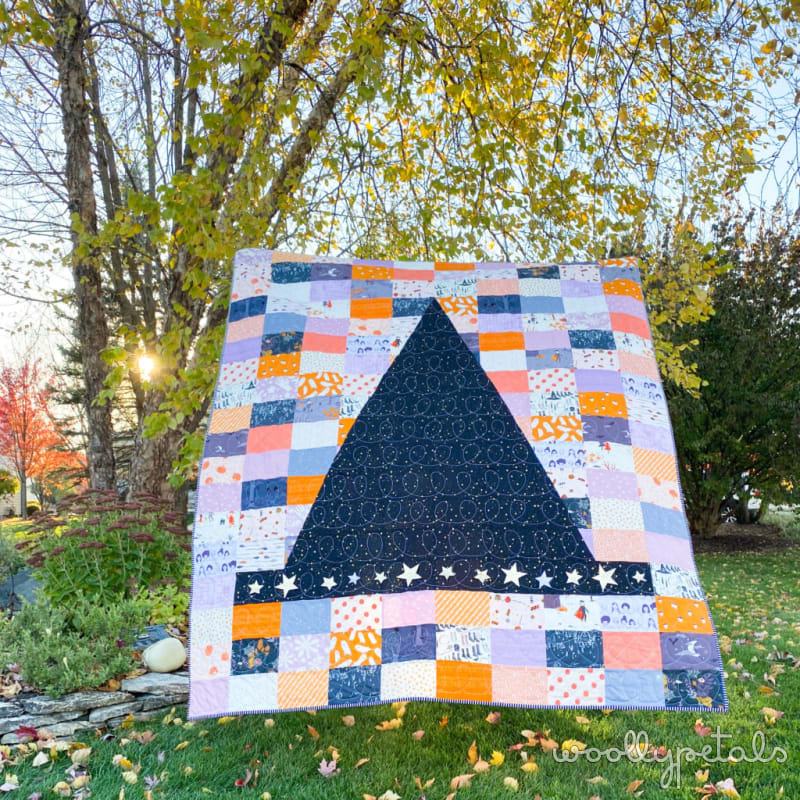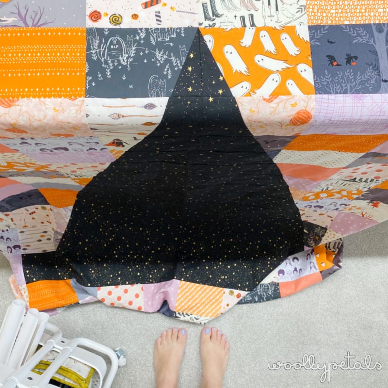 I was able to fully finish this fun witch hat. The original Something Wicked Quilt pattern. I did make the hat from one fabric. Yes I did still cut it up into rectangles. Lol. But that is the quickest way for me since I chain piece the whole top. I did add a little flare at the bottom as well by using metallic felt from Benzie Designs. I cut out stars and used DMC floss to basically hand tie them across the bottom of the hat.
