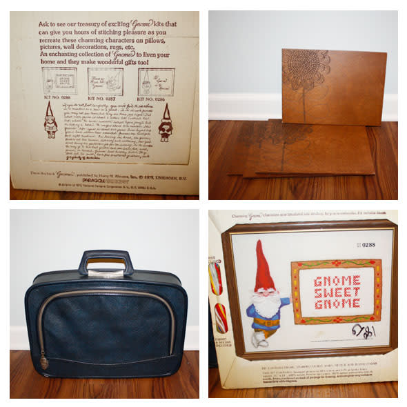 Some of my finds included a wood picture, a mini navy blue suitcase, two bird wall art scupltures to be painted, a gnome embroidery kit, 4 wood engraved placemats?, and a couple clothing items (not pictured).