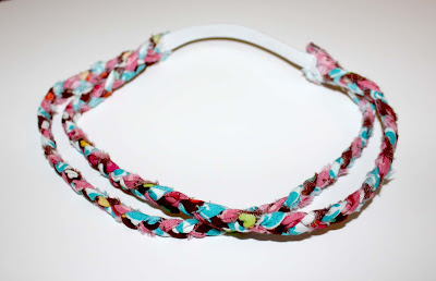 The 2nd one I cute 2 strips each of 3 fabrics, each strip was about 1/2″ wide x 18″ long, then I braided the 3 different strips together (twice), super simple, then I layered the ends and added a 3″-4″ piece of elastic.