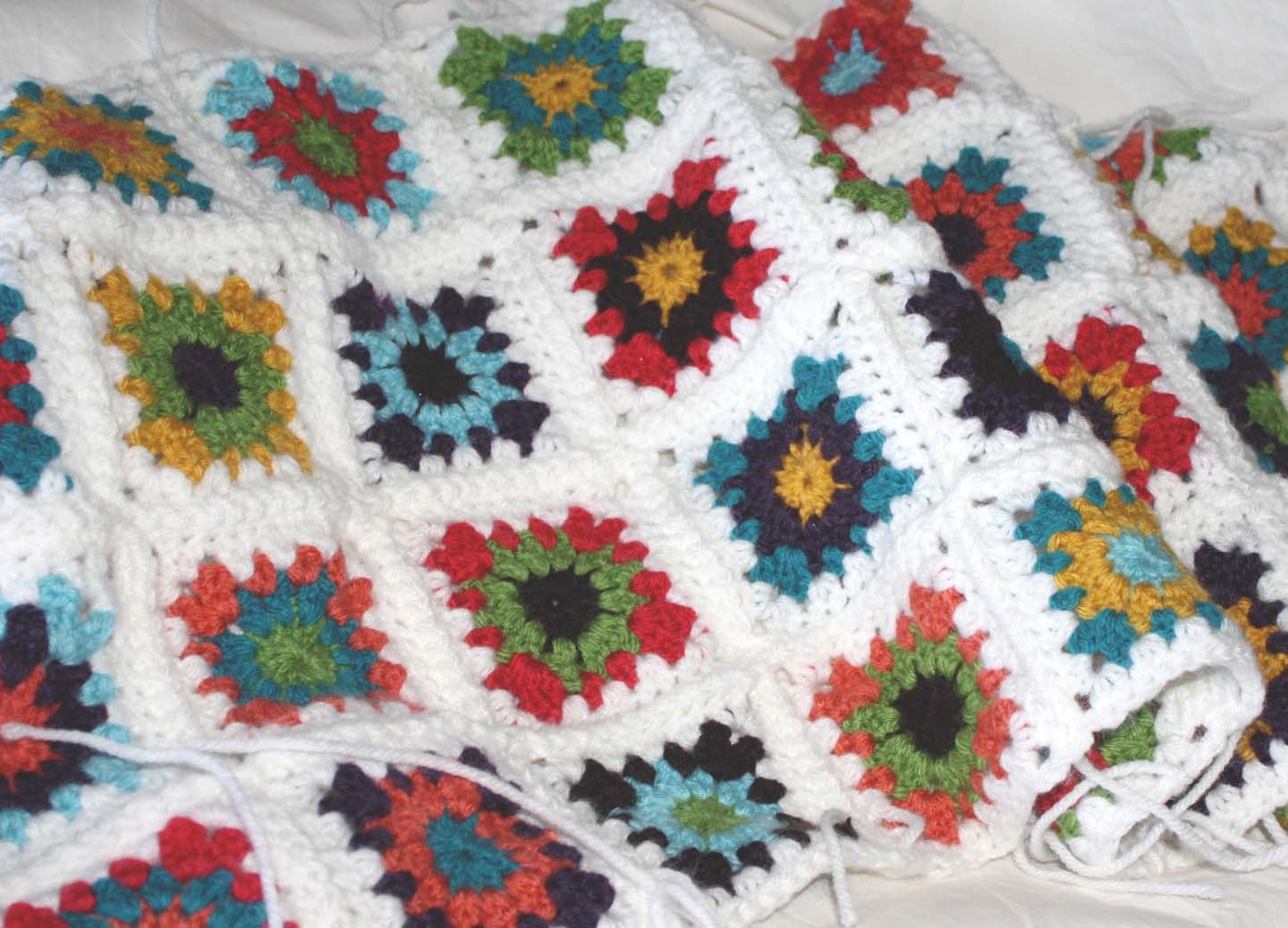 I love the afghan! The white makes it so striking. I just started crocheting and I'm addicted to granny squares. Unfortunately my wrists got tired so I'm having to lay off them for a while!
