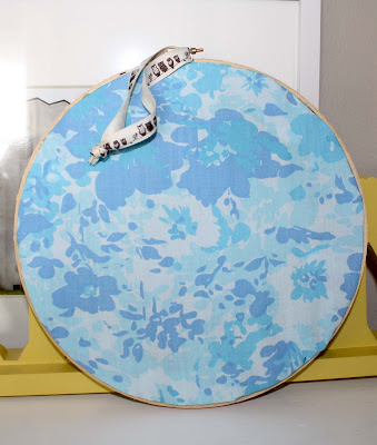 The back is covered in a vintage sheet. It is all stretched in a 10″ embroidery hoop and hung by a cute owl ribbon.
