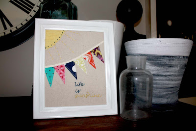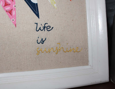 The quote “life is sunshine” is hand stitched. I love the Lucinda Handwriting font for my fabric collages as it looks like free style cursive. I usually print out whatever saying I want and then trace it onto the base fabric. Easy Peasy!
