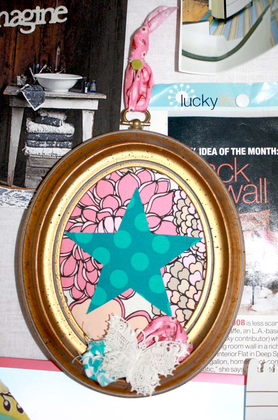 Lastly I made this mini framed applique. I found this frame at the thrift store and loved the little metal hook in the top. I am not a huge fan of the gold and might have painted it if I wasn’t so impatient. But now I think it works!