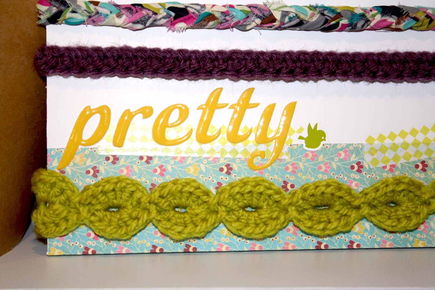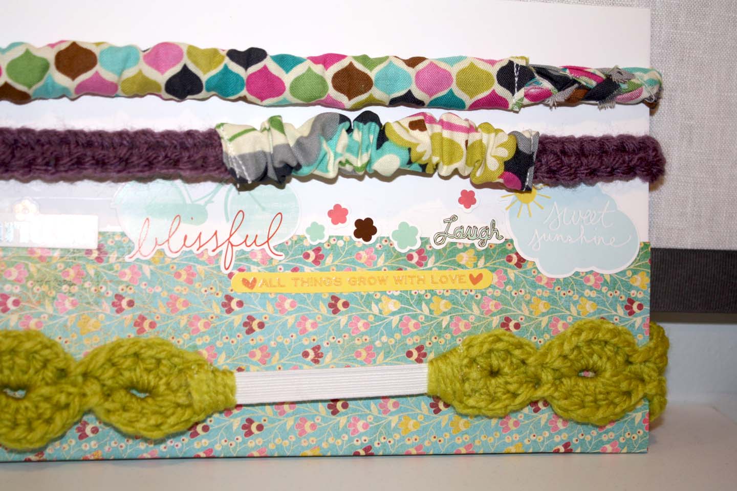 I covered the elastic on the top two with fabric. On the bottom one I didn’t want to have to sew the fabric cover over the ends because it would cover to much of the last circles, so I just covered the stitching with wrapped yarn.