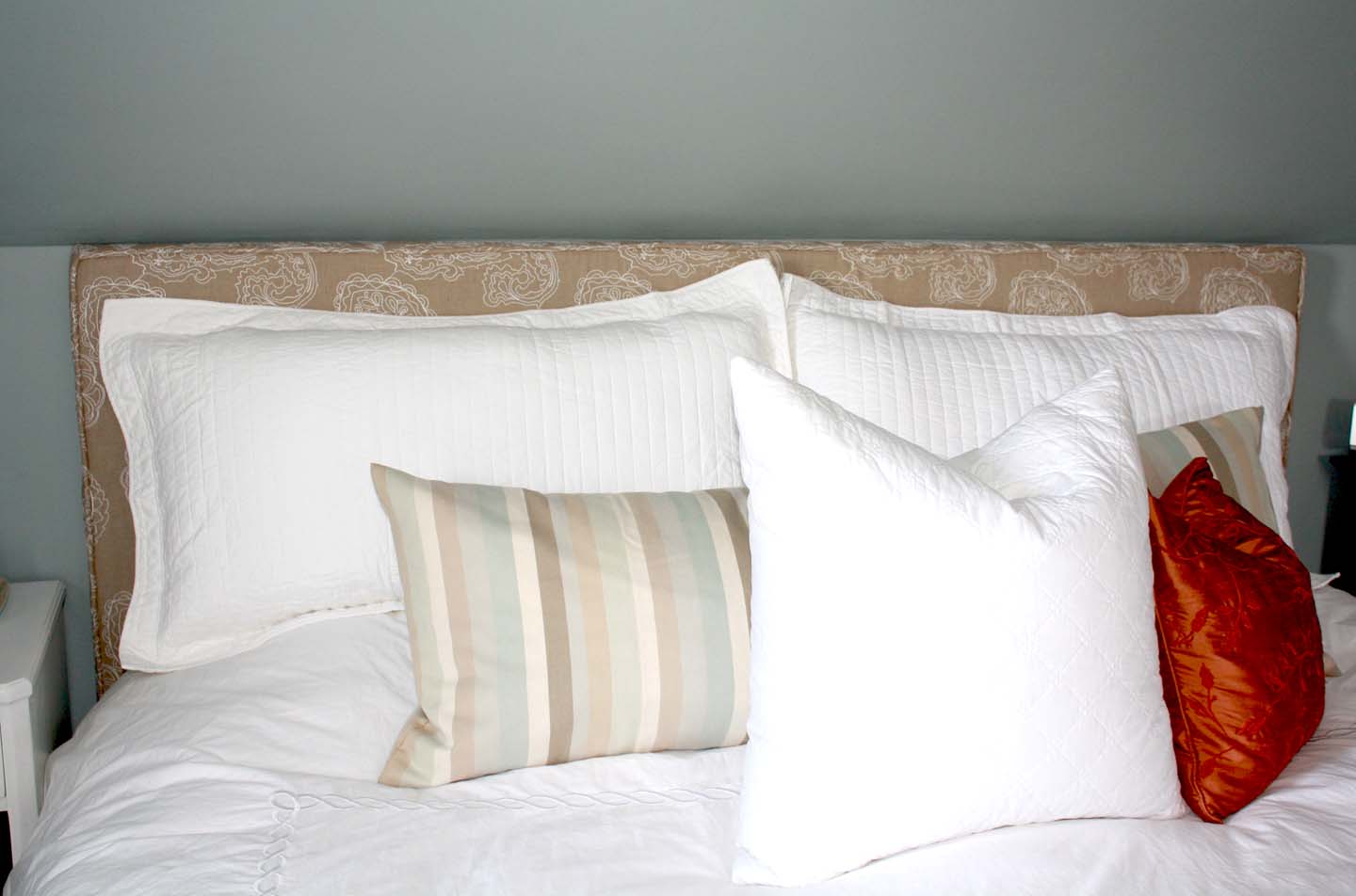 I then had to revamp my pillows as they where mostly beige before, and went all white with a splash of color. I found the orange pillow at Homegoods, and made the striped cover for my body pillow.