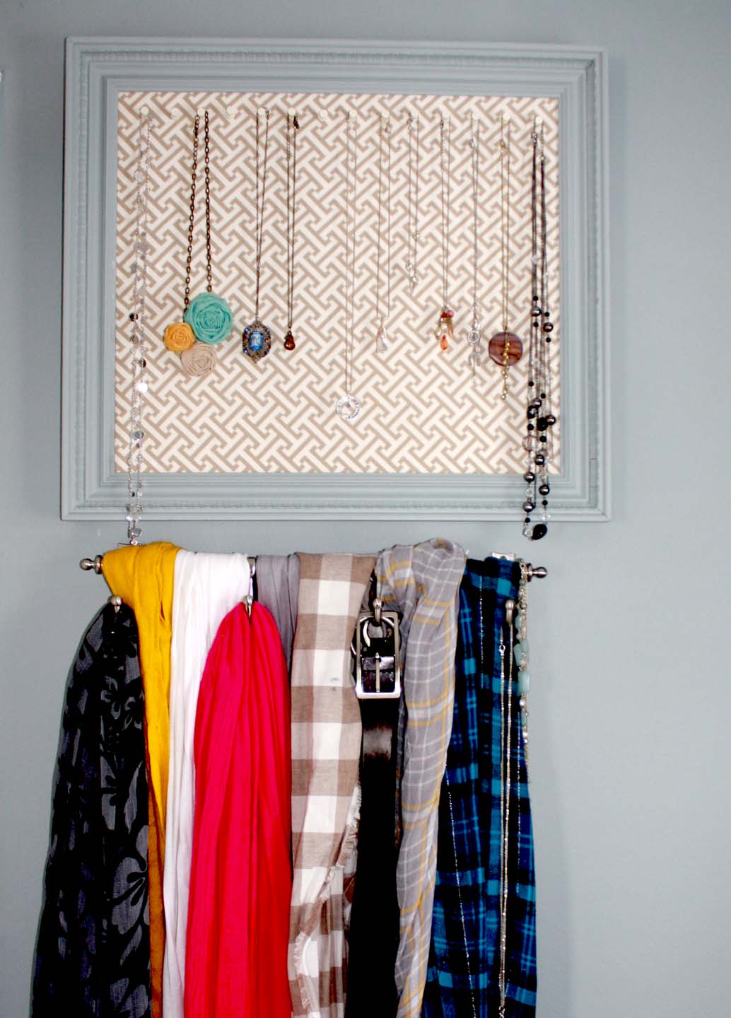 I also made this Necklace holder our of an old frame, foam core, and cute fabric. It is hanging above a hook bar that I put my scarfs and belts on.