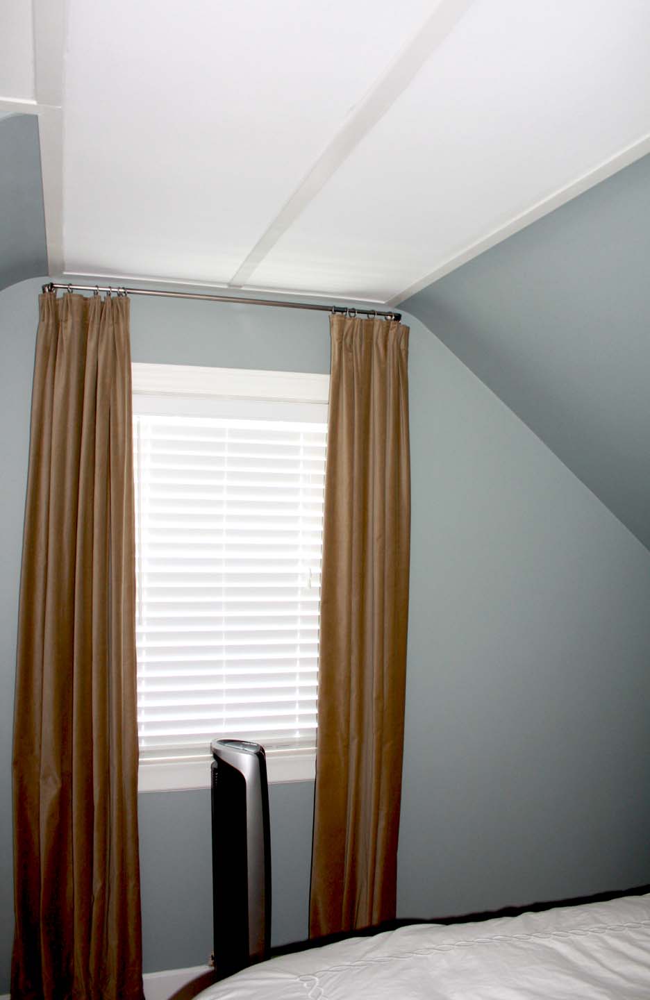 I kept the existing curtains as they are cotton velvet and just shorten them from a puddle to just touching the ground. I also replaced our awful mini blinds with faux wood blinds, which in my opinion look SO much better and give more light control at night, which living close to a busy road is necessary.