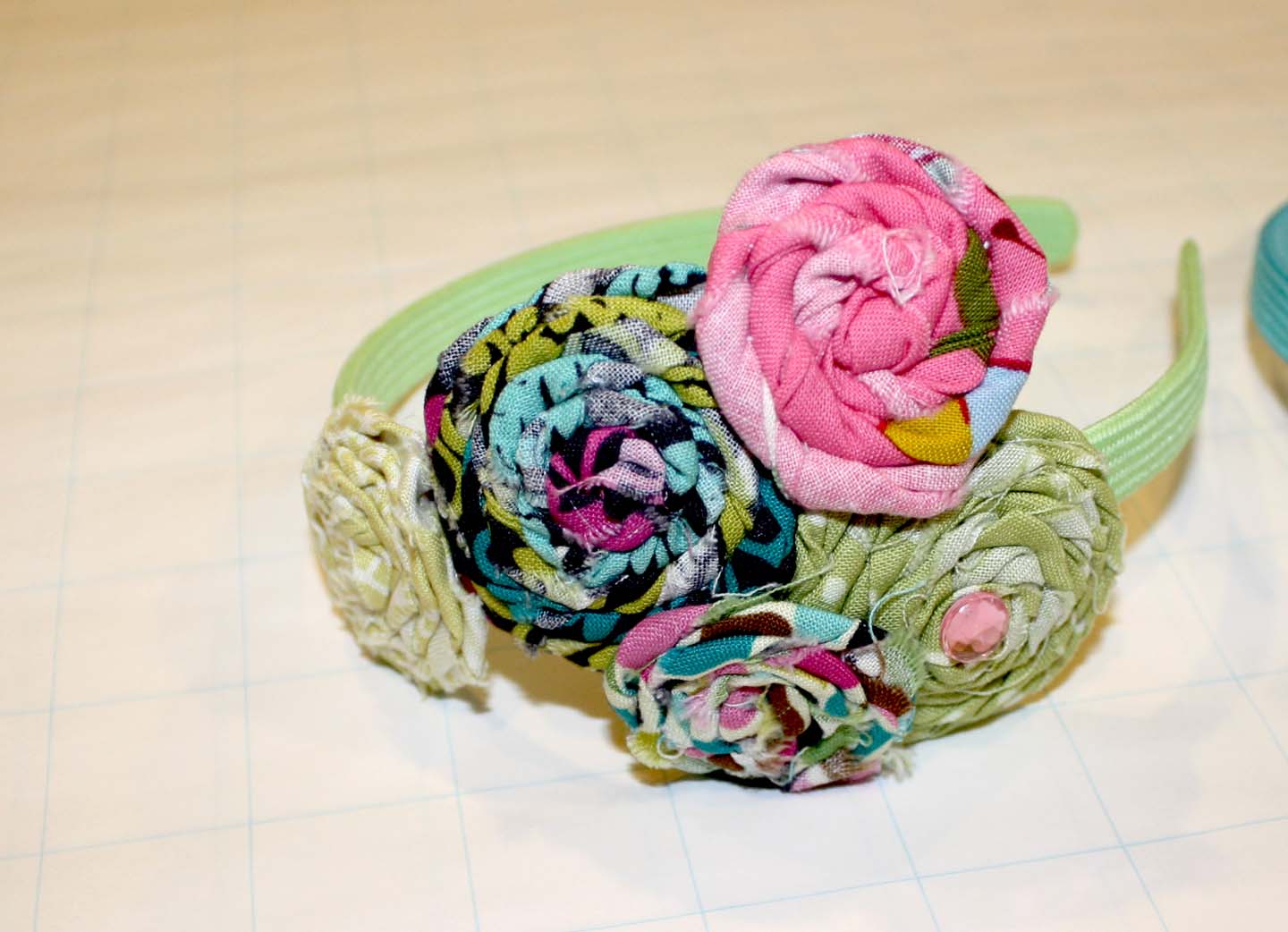 I added some fun little jewels to a large flower on each headband for some extra sparkle. I then attached them to brightly colored goody fabric headbands.